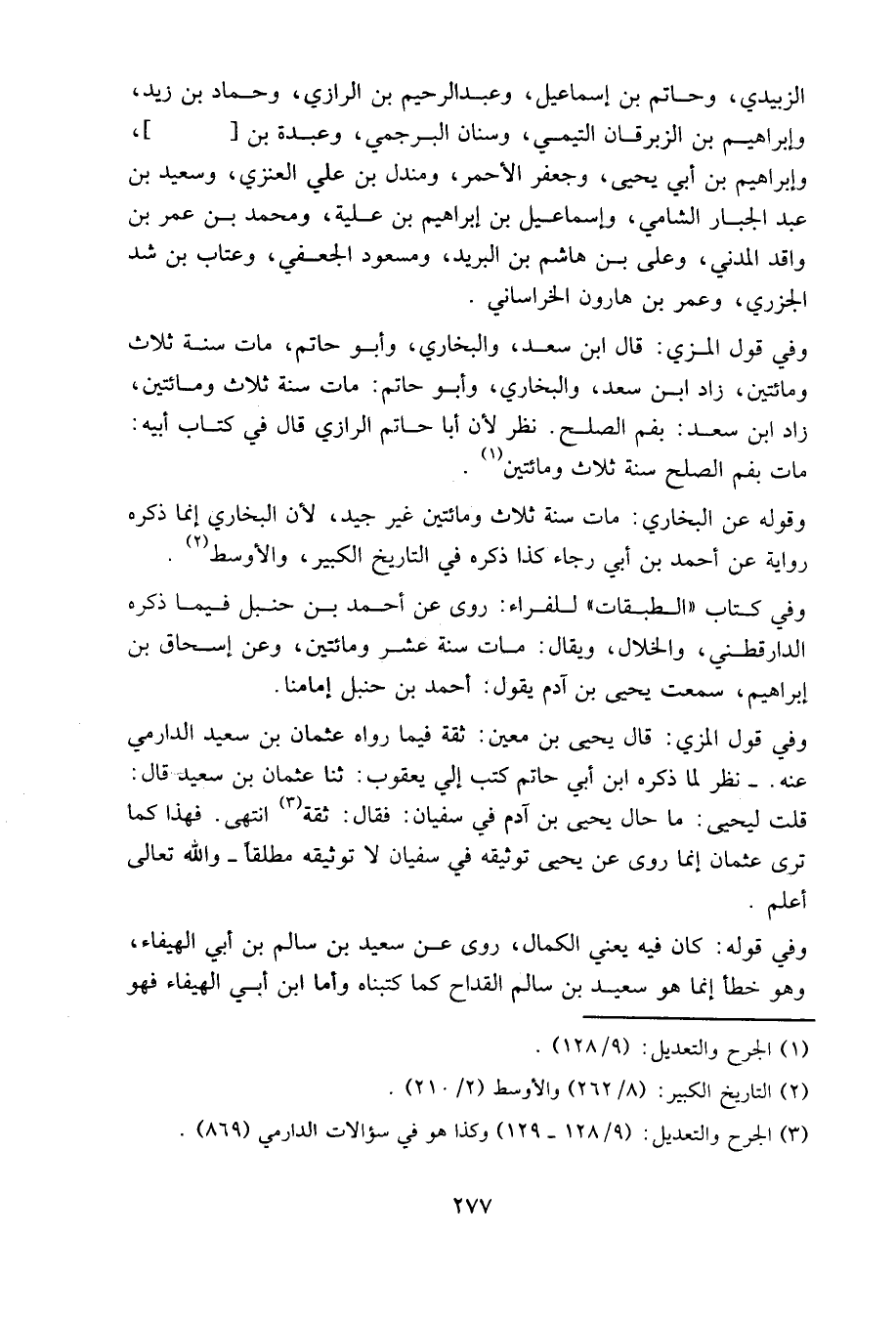 وفي قول المزي: قال يحيى بن معين: ثقة فيما رواه عثمان بن سعيد الدارمي عنه نظر؛ لما ذكره ابن أبي حاتم: كتب إلي يعقوب: حَدَّثنا عثمان بن سعيد قال: قلت ليحيى: ما حال يحيى بن آدم في سفيان؟ فقال: ثقة انتهى. فهذا كما ترى عثمان إنما روى عن يحيى توثيقه في سفيان، لا توثيقه مطلقا، والله تعالى أعلم.