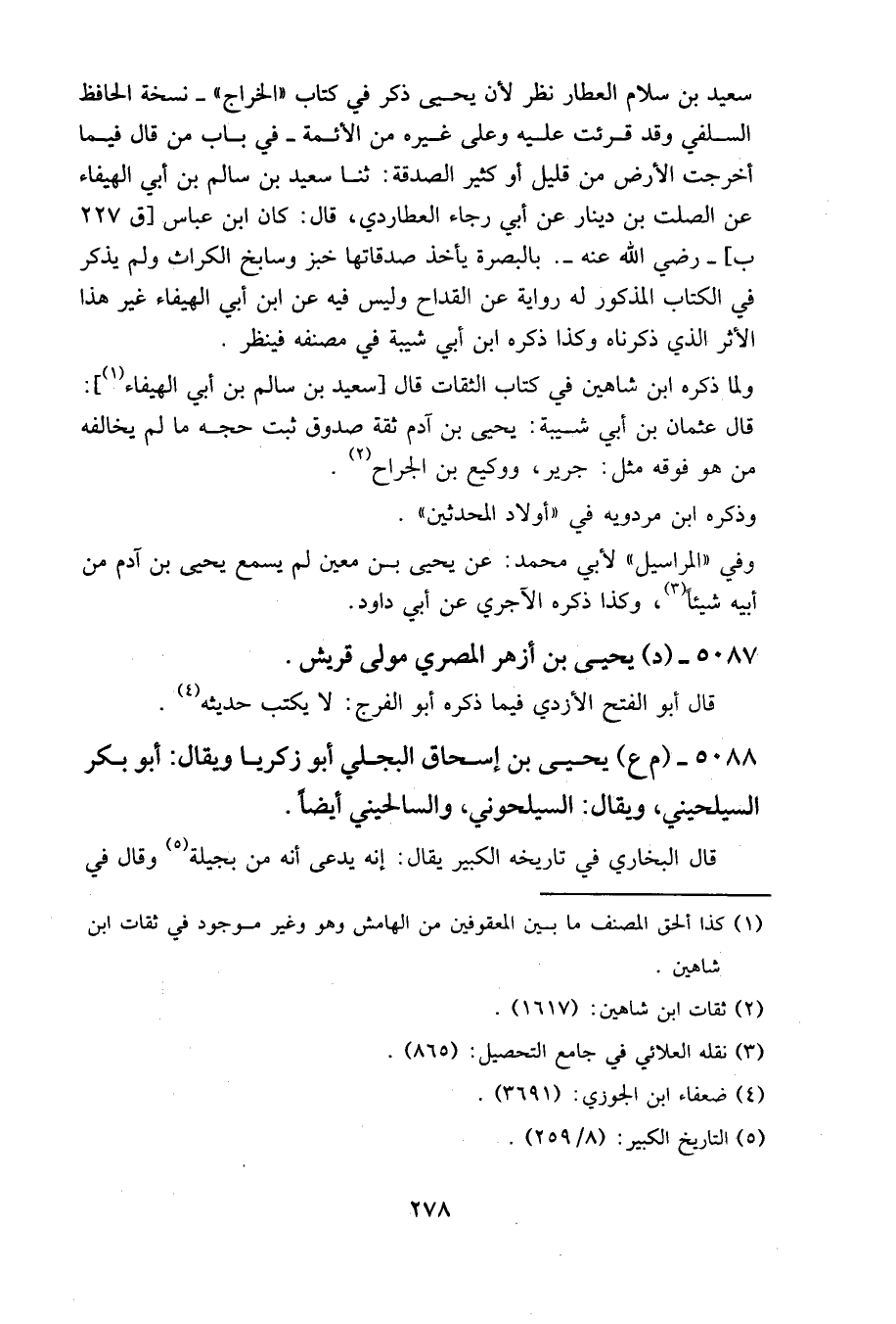 ولما ذكره ابن شاهين في كتاب "الثقات" قال [سعيد بن سالم بن أبي الهيفاء]: قال عثمان بن أبي شيبة: يحيى بن آدم ثقة، صدوق، ثبت، حجة، ما لم يخالفه من هو فوقه مثل: جرير، ووكيع بن الجراح.