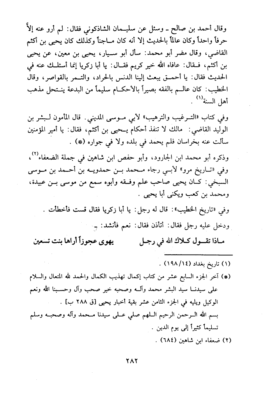وقال أحمد بن صالح وسئل عن سليمان الشاذكوني فقال: لم أرو عنه إلا حرفا واحدا، وكان عالما بالحديث، إلا أنه كان ماجنا، وكذلك كان يحيى بن أكثم القاضي،