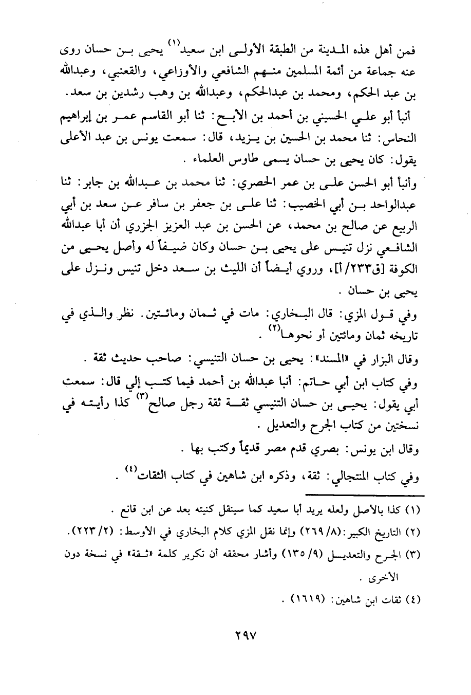 وفي كتاب ابن أبي حاتم: أنبأ عبد الله بن أحمد فيما كتب إلي قال: سمعت أبي يقول: يحيى بن حسان التنيسي ثقة ثقة رجل صالح، كذا رأيته في نسختين من كتاب الجرح والتعديل.