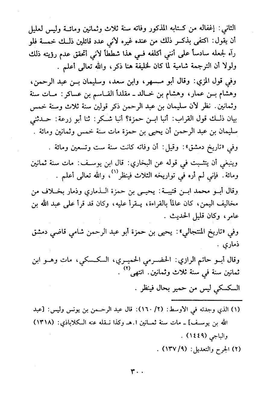 الثاني: إغفاله من كتابه المذكور وفاته سنة ثلاث وثمانين ومِائَة، وليس لعليل أن يقول: اكتفى بذكر ذلك من عنده غيره؛ لأني عدد قائلين ذلك خمسة، فلو رآه لجعله سادسا، على أنني أكلفه في هذا شططا؛ لأني أتحقق عدم رؤيته ذلك، ولولا أن الترجمة شامية لما كان لخليفة هنا ذكر، والله تعالى أعلم.