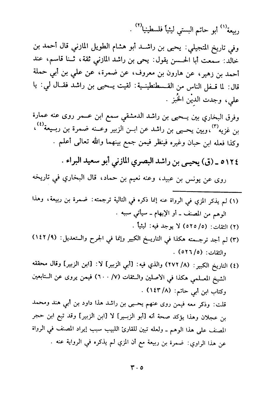 وفرق البخاري بين يحيى بن راشد الدمشقي، سمع ابن عمر، روى عنه عمارة بن غزية، وبين يحيى بن راشد عن ابن الزبير، وعنه ضمرة بن ربيعة، وكذا فعله ابن حبان وغيره، فينظر فيمن جمع بينهما، والله تعالى أعلم.