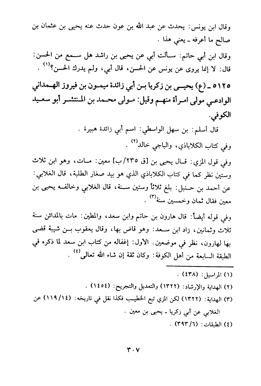 5125- (ع) يحيى بن زكريا بن أبي زائدة ميمون بن فيروز الهمداني الوادعي، مولى امراة منهم، وقيل: مولى محمد بن المنتشر، أبو سعيد الكوفي.