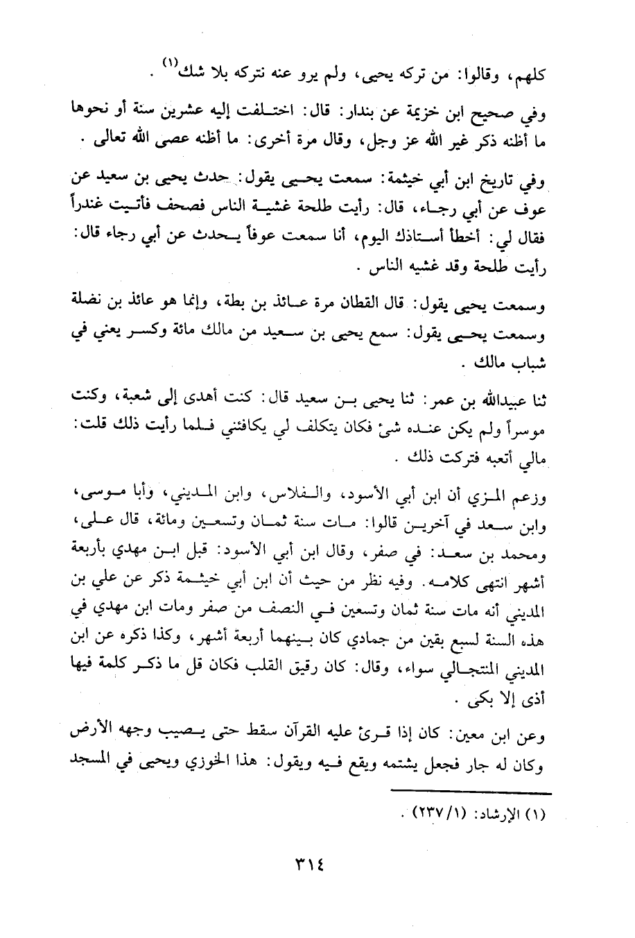 وفي تاريخ ابن أبي خيثمة: سمعت يحيى يقول: حدث يحيى بن سعيد عن عوف عن أبي رجاء، قال: رأيت طلحة غشيه الناس فصحف، فأتيت غندرا فقال لي: أخطأ أستاذك اليوم، أنا سمعت عوفا يحدث عن أبي رجاء قال: رأيت طلحة وقد غشيه الناس.