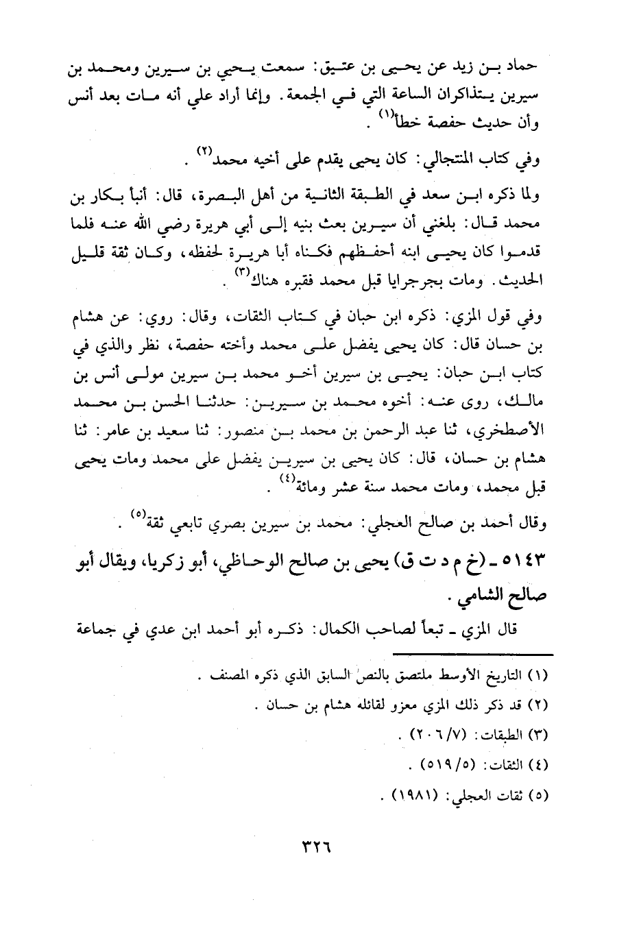 وفي قول المزي: ذكره ابن حبان في كتاب "الثقات"، وقال: روي عن هشام بن حسان قال: كان يحيى يفضل على محمد وأخته حفصة نظر، والذي في كتاب ابن حبان: يحيى بن سيرين أخو محمد بن سيرين مولى أنس بن مالك،