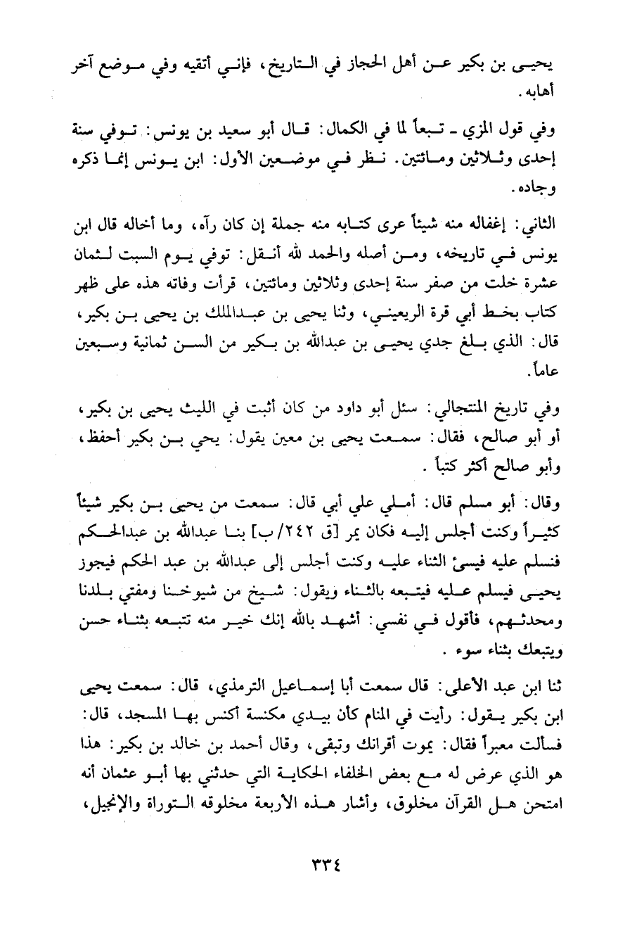 حدثنا ابن عبد الأعلى: قال سمعت أبا إسماعيل الترمذي، قال: سمعت يحيى بن بكير يقول: رأيت في المنام كأن بيدي مكنسة أكنس بها المسجد، قال: فسألت معبرا فقال: يموت أقرانك وتبقى، وقال أحمد بن خالد بن بكير: هذا هو الذي عرض له مع بعض الخلفاء الحكاية التي حدثني بها أبو عثمان أنه امتحن: هل القرآن مخلوق؟ وأشار: هذه الأربعة مخلوقة: التوراة، والإنجيل،