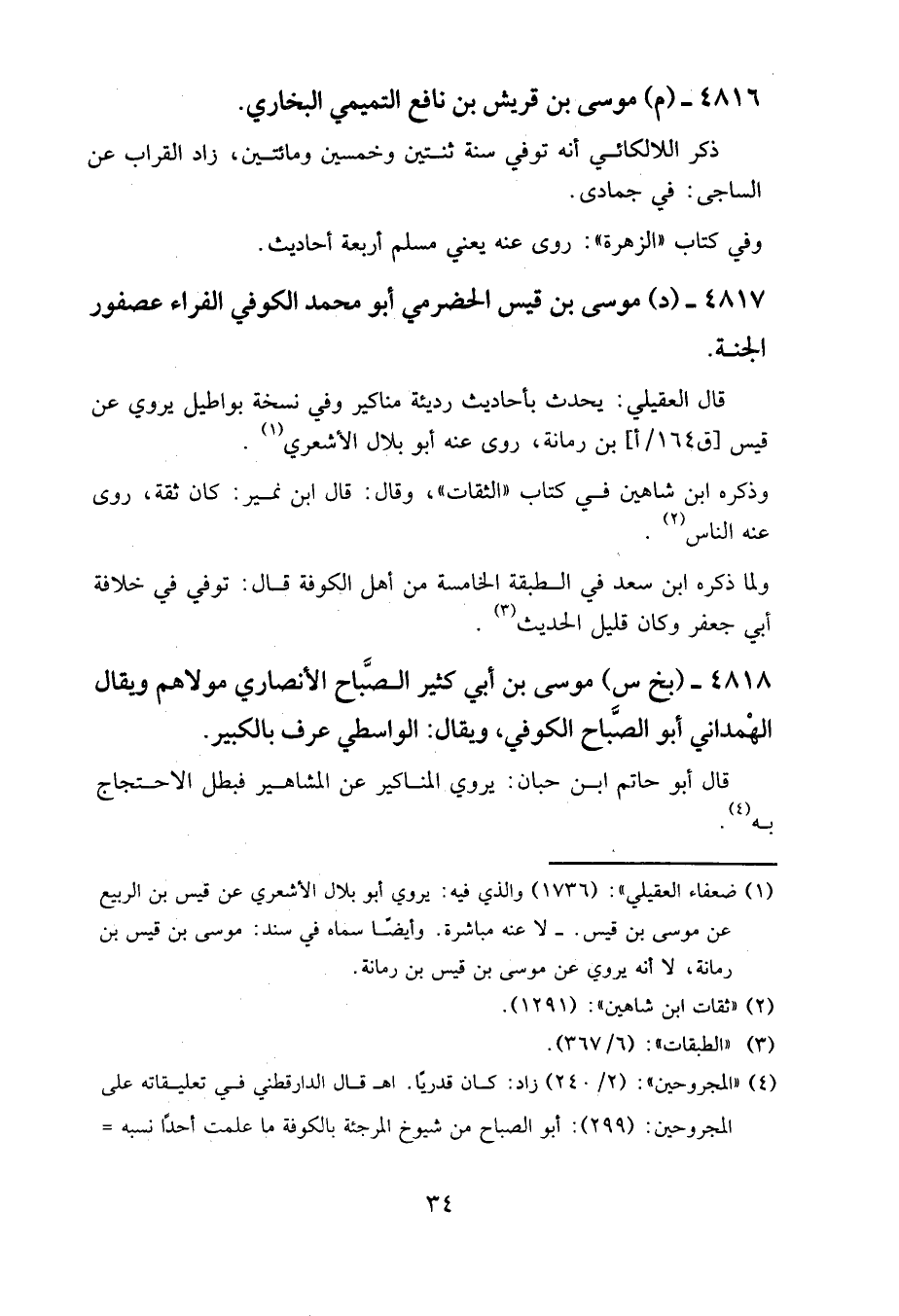 4818- (بخ س) موسى بن أبي كثير الصباح الأنصاري مولاهم، ويقال: الهمداني، أبو الصباح الكوفي، ويقال: الواسطي، عرف بالكبير.