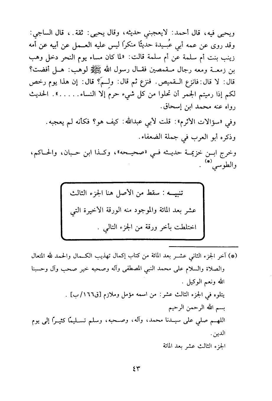 تنبيه: سقط من الأصل هنا الجزء الثالث عشر بعد المِئَة، والموجود منه الورقة الأخيرة التي اختلطت بآخر ورقة من الجزء التالي.