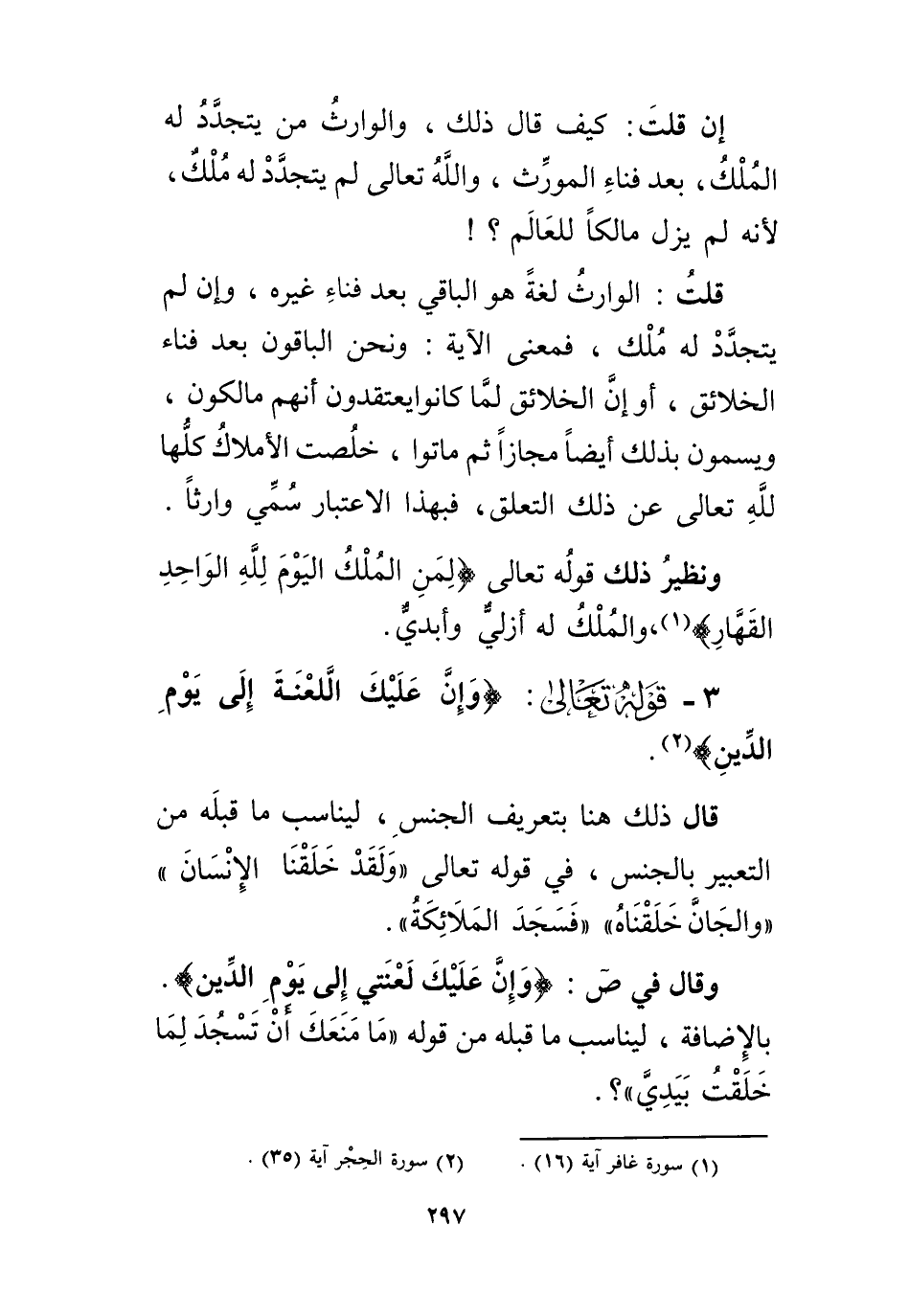95 - قوله تعالى: (وَلِلَّهِ يَسْجُدُ مَا فِي السَّموَاتِ وَمَا فِي الأَرضِ مِنْ دَابَّةٍ. .) ، تجوَّزَ بالسجود عن الانقياد، فيما لا يعقل، والسُّجودِ على الجبهة فيمن يعقل، ففيه جمعٌ بين الحقيقة والمجاز، وإنَّما لم يُغَلِّب العقلاء من الدَّواب على غيرهم، كما في آية (واللهُ خَلَقَ كلَّ دَابَّة مِنْ مَاءٍ) لأنه أراد هنا عموم كلِّ دابة، ولم يقترنْ بتغليب، فجاء ب " ما " التي تعمُّ النوعين، وفي تلك - وإن أراد العموم - لكنَّه اقترن بتغليبٍ، وهو ذكرُ ضميرِ العقلاء، في قوله " فَمِنْهُمْ مَنْ يَمْشِي " فجاء ب " مِنْ " تغليباً للعقلاء.