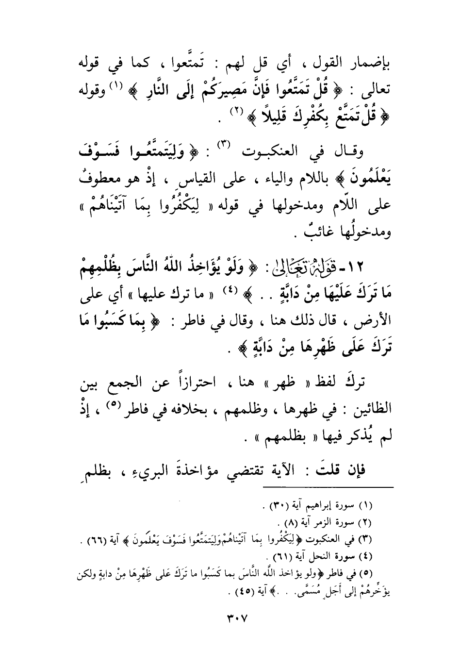 27 - قوله تعالى: (ثُمَّ إِنَّ رَبَّكَ لِلَّذِينَ هَاجَرُوا مِنْ بَعْدِ مَا فُتِنُوا. .) الآية. كرَّر فيها وفي قوله بعدُ: (ثمَّ إنَّ رَبَّكَ لِلَّذينَ عَمِلُوا السُّوءَ بجهالة) الآية. " إنَّ رَبَّكَ " لطول الكلام بين اللفظين، قيل: ومثلُه: (أَيَعِدُكُمْ أَنَّكُمْ إذَا مِتُّمْ وَكنْتُمْ تُرَاباً وَعِظَاماً أَنَّكُمْ مُخْرَجُونَ) .