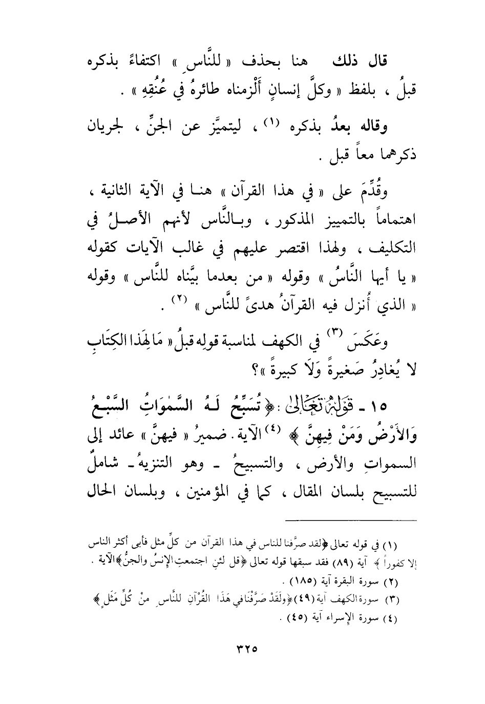 " بقادرٍ " وفي يس " أوليس الذي خلق السمواتِ والأرضَ بقادرٍ ". . لأن ما هنا خبر " إن "، وما في يس خبر " ليسَ " وخبرها تدخلُه الباء، وما في الأحقاف خبرُ " إنَّ " وكانَ القياسُ عدمُ دخول الباء فيه، لكنَّها دخلته تشبيهاً لـ " لَمْ " بـ " ليس " في النفي.
