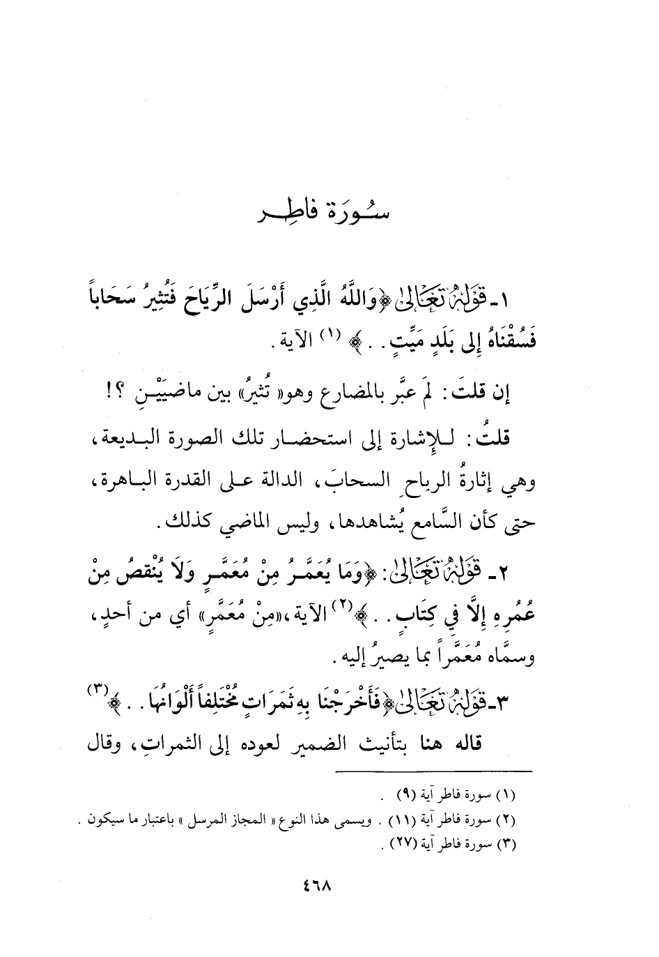 المزمِّل، بقوله " رَبّ المَشْرِقِ وَالمَغْرِبِ " أراد مشرق الصيف والشتاء ومغربهما، وجَمَع وفَصّل في المعارج بقوله " فَلَا أً قْسِمُ بِرَبِّ المَشَارِقِ وَالمَغَارِبِ " أراد جميع مشارق السَّنَة ومغاربها، وهي تزيد على سبعمائة، وثنَّى وفصَّل في الرحمن بقوله " رَبّ المشرقَيْنِ وربُّ المَغْرِبَينِ " أراد مشرقي الصيف والشتاء ومغربهما، وجمع وحذفَ هنا بقوله " ربُّ المشارق " أراد جميع مشارق السنة، واقتصر عليه لدلالته على المحذوف، وخصَّ ما هنا بالجمع موافقةً للجموع أول السورة، وبالحذف مناسبة للزينة في قوله " إنا زينا السماءَ الدنيا بزينةٍ الكواكب " إذِ الزينةُ إنما تكون غالباً بالضياء والنو، وهما ينشئان من المشرقِ لا من المغرب، وما في الرحمن بالتثنية، موافقة للتثنية في " يسجدان " وفي " فبأيِّ آلاء ربكما تُكَذِّبان " وبذكرِ المتقابِلَيْن موافقةً لبسط صفاته تعالى وإنعاماته ثمَّ، وما في المعارج بالجمع، موافقةً للجمع قبله وبعده، وبذكرِ المقابِلَيْنِ موافقةً لكثرة التأكيد في القسم وجوابه، وما في المزمِّل بالإِفراد موافقةً لما قبلَه، من إفراد ذكر النبي - صلى الله عليه وسلم -، وما بعدَه من إفراد ذكرِ الله تعالى، وبذِكرِ
