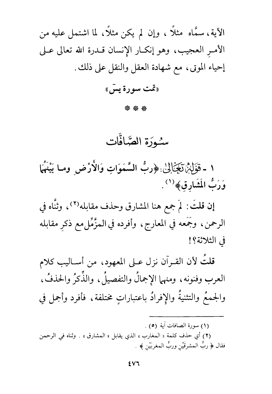 1 - قوله تعالى: (ص) إن جُعل اسماً للسورة، فهو خبر مبتدأٍ محذوفٍ أي هذه " صَ " السورة التي أعجزت العرب، فقوله " والقرآنِ ذي الذكر " قسمُ عجز العرب، كقولك: هذا حاتمٌ واللَّهِ، أي هذا هو المشهور بالسخاء واللَّهِ، وإن جُعلَ قَسَماً فجوابه مع ما عُطف عليه محذوفٌ تقديره: إنه كلامٌ معجز، أو لنهلكنَّ أعداءك بقرينة قوله " كمْ أهلكْنَا مِنْ قبلِهمْ مِن قَرْنٍ " أو جوابه " كَمْ " وأصله " لَكَمْ " حُذفت اللاَّم لطول الكلام تخفيفاً، كما في قوله تعالى " والشَّمسِ وضُحَاهَا. . قَدْ أفلَحَ مَنْ زَكَّاهَا " وقيل: غير ذلك.