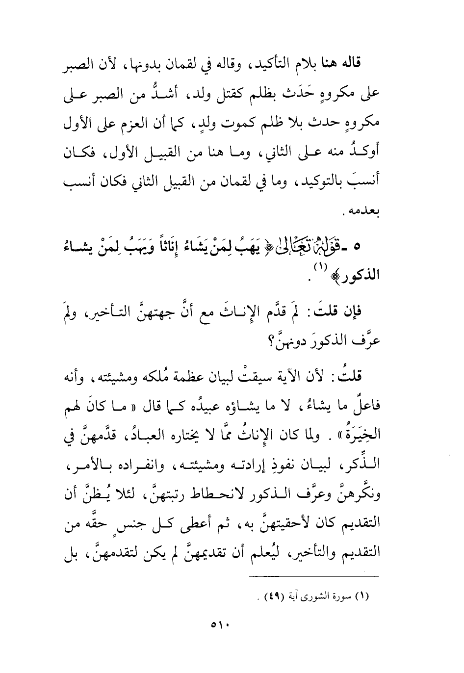 قلتُ: لأنه تعالى لما ذكر العالَم ضمناً، ولا بدَّ له من، صانعٍ، موصوفٍ بصفات الكمال، ومن الِإيمان بالصانع ناسب. ختم الأولى بالمؤمنين، ولمَّا كان الِإنسان أقرب إلى الفهم من غيره، وكان فكرُه في خلْقهِ وخلْقِ الدوابّ ممَّا يزيده يقيناً في: إيمانه، ناسب ختم الثانية بقوله " يوقنون " ولما كان جزئيات