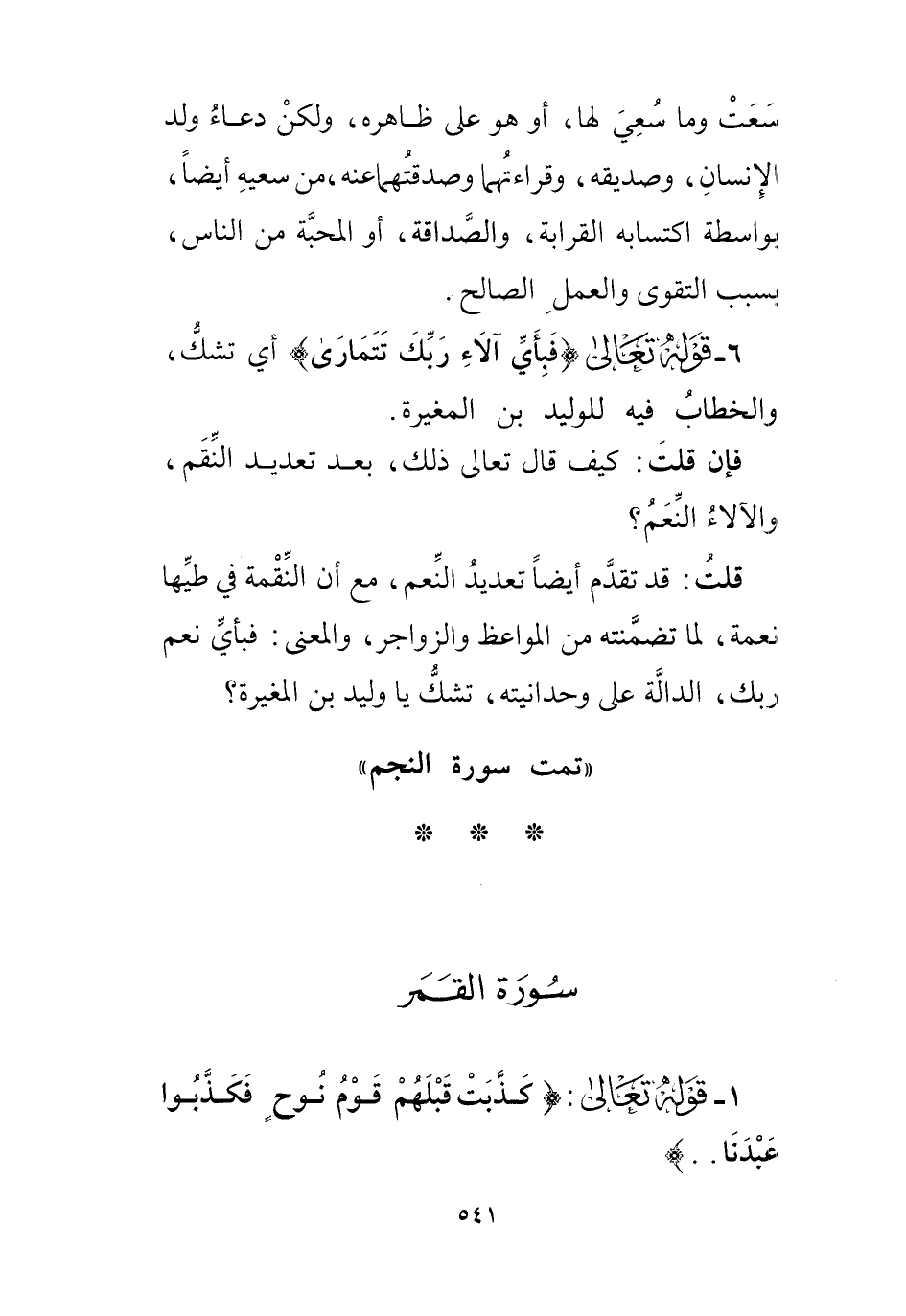 قلتُ: معنى " إنزاله تعالى له " أنه علَّمه جبريل، وأمَره أن يعلِّمه النبي - صلى الله عليه وسلم -، ويأمره أن يُعلمه لأمته، مع أنه لم يزل ولا يزال صفةً للَّهِ تعالى قائمةً به لا تفارقه.