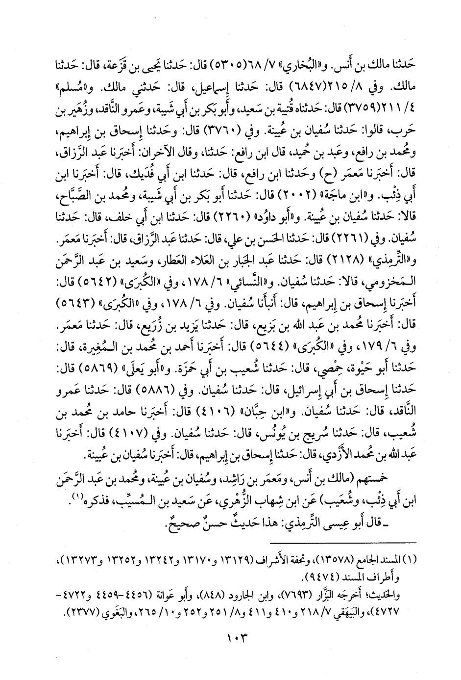وفي (٣٧٦٠) قال: وحدثنا إسحاق بن إبراهيم، ومحمد بن رافع، وعَبد بن حُميد، قال ابن رافع: حدثنا، وقال الآخران: أخبرنا عبد الرزاق، قال: أخبرنا مَعمَر (ح) وحدثنا ابن رافع، قال: حدثنا ابن أبي فُديك، قال: أخبرنا ابن أبي ذِئب. و «ابن ماجة» (٢٠٠٢) قال: حدثنا أَبو بكر بن أبي شيبة، ومحمد بن الصباح، قالا: حدثنا سفيان بن عُيينة. و «أَبو داود» (٢٢٦٠) قال: حدثنا ابن أبي خلف، قال: حدثنا سفيان. وفي (٢٢٦١) قال: حدثنا الحسن بن علي، قال: حدثنا عبد الرزاق، قال: أخبرنا مَعمَر. و «التِّرمِذي» (٢١٢٨) قال: حدثنا عبد الجبار بن العلاء العطار، وسعيد بن عبد الرَّحمَن المخزومي، قالا: حدثنا سفيان. و «النَّسَائي» ٦/ ١٧٨، وفي «الكبرى» (٥٦٤٢) قال: أخبرنا إسحاق بن إبراهيم، قال: أنبأنا سفيان. وفي ٦/ ١٧٨، وفي «الكبرى» (٥٦٤٣) قال: أخبرنا محمد بن عبد الله بن بزيع، قال: حدثنا يزيد بن زُريع، قال: حدثنا معمر. وفي ٦/ ١٧٩، وفي «الكبرى» (٥٦٤٤) قال: أخبرنا أحمد بن محمد بن المغيرة، قال: حدثنا أَبو حيوة، حمصي، قال: حدثنا شعيب بن أبي حمزة. و «أَبو يَعلى» (٥٨٦٩) قال: حدثنا إسحاق بن أبي إسرائيل، قال: حدثنا سفيان. وفي (٥٨٨٦) قال: حدثنا عَمرو الناقد، قال: حدثنا سفيان. و «ابن حِبَّان» (٤١٠٦) قال: أخبرنا حامد بن محمد بن شعيب، قال: حدثنا سريج بن يونس، قال: حدثنا سفيان. وفي (٤١٠٧) قال: أخبرنا عبد الله بن محمد الأزدي، قال: حدثنا إسحاق بن إبراهيم، قال: أخبرنا سفيان بن عُيينة.