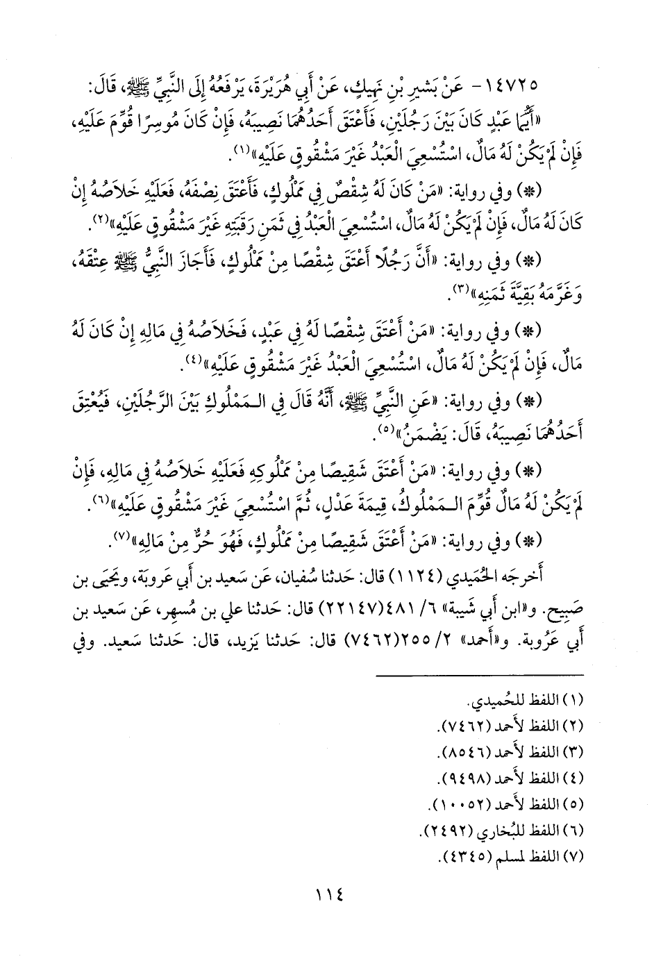 - وفي رواية: «من أعتق شقيصا من مملوك، فهو حر من ماله» (¬٧).