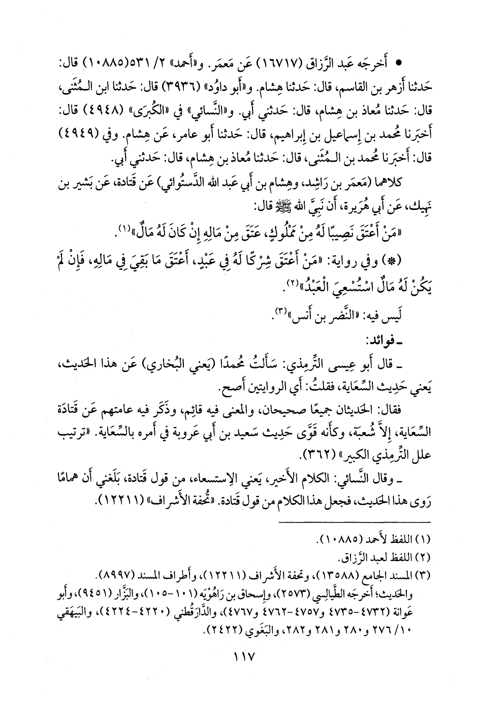 - وقال النَّسَائي: الكلام الأخير، يعني الاستسعاء، من قول قتادة، بلغني أن هماما روى هذا الحديث، فجعل هذا الكلام من قول قتادة. «تحفة الأشراف» (١٢٢١١).