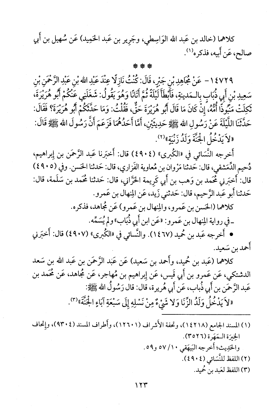 كلاهما (عَبد بن حُميد، وأحمد بن سعيد) عن عبد الرَّحمَن بن عبد الله بن سعد الدشتكي، عن عَمرو بن أبي قيس، عن إبراهيم بن مهاجر، عن مجاهد، عن محمد بن عبد الرَّحمَن بن أبي ذُبَاب، عن أبي هريرة، قال: قال رسول الله صَلى الله عَليه وسَلم: