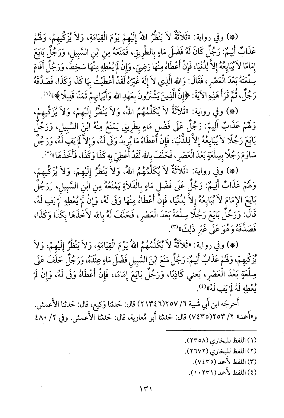 - وفي رواية: «ثلاثة لا يكلمهم الله يوم القيامة، ولا ينظر إليهم، ولا يزكيهم، ولهم عذاب أليم: رجل منع ابن السبيل فضل ماء عنده، ورجل حلف على سلعة بعد العصر، يعني كاذبا، ورجل بايع إماما، فإن أعطاه وفى له، وإن لم يعطه له لم يف له» (¬١).