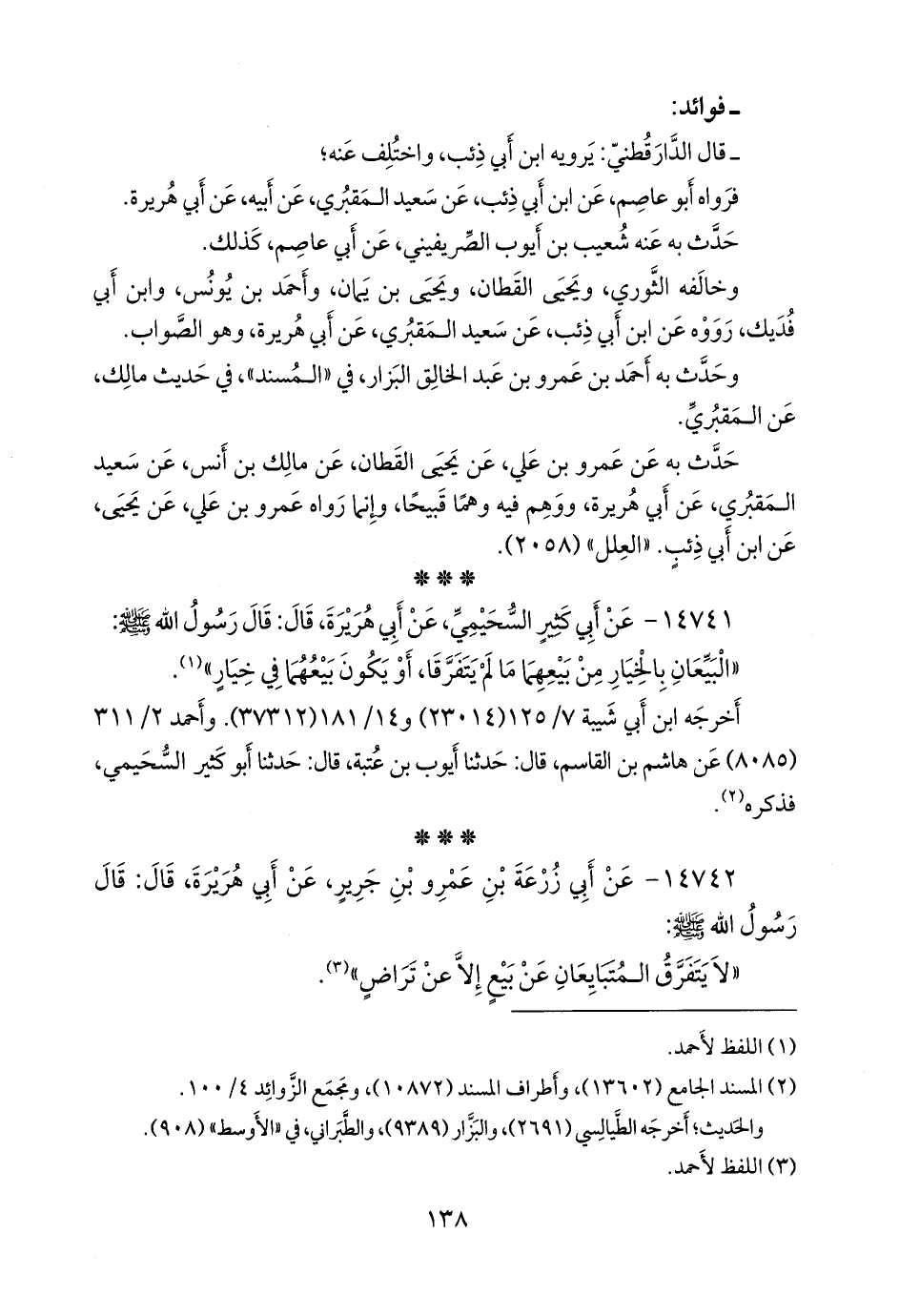 - وفي رواية: «عن يحيى بن أيوب، قال: كان أَبو زُرعَة إذا بايع رجلا خيره، قال: ثم يقول: خيرني، ويقول: سمعت أبا هريرة يقول: قال رسول الله صَلى الله عَليه وسَلم: لا يفترقن اثنان إلا عن تراض» (¬٢).