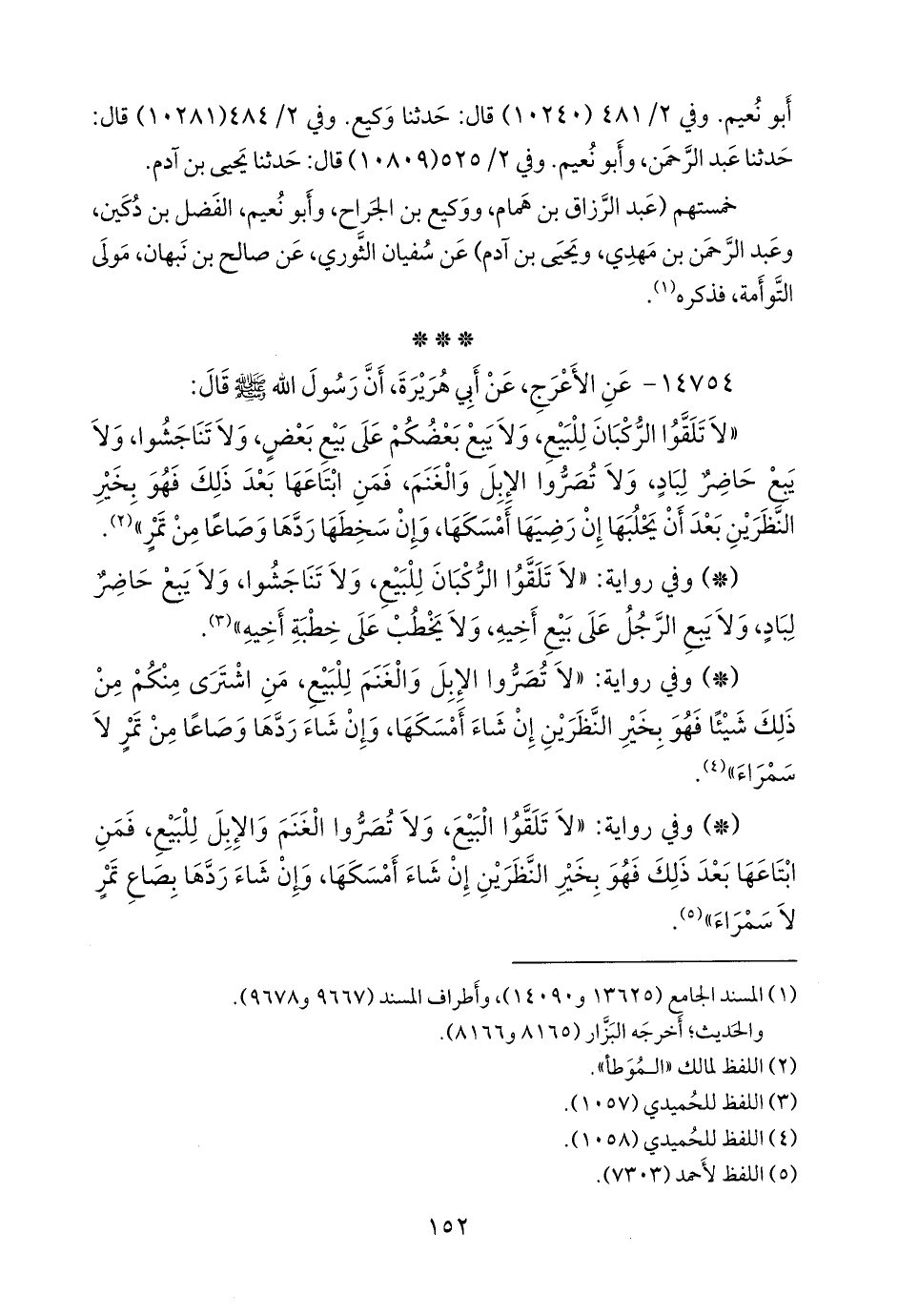 - وفي رواية: «لا تلقوا البيع، ولا تصروا الغنم والإبل للبيع، فمن ابتاعها بعد ذلك فهو بخير النظرين إن شاء أمسكها، وإن شاء ردها بصاع تمر لا سمراء» (¬٤).