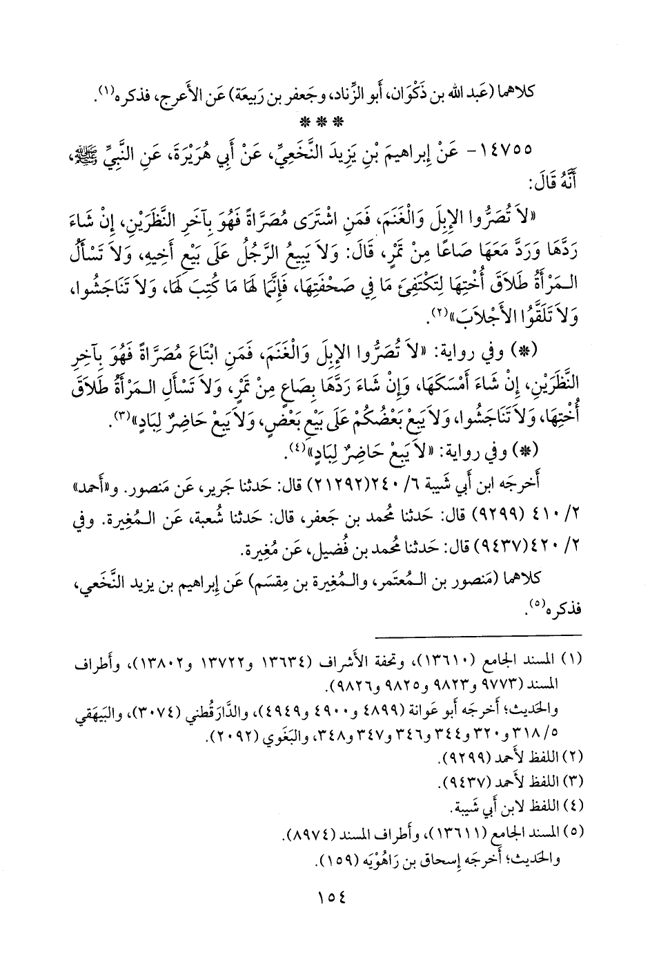 «لا تصروا الإبل والغنم، فمن اشترى مصراة فهو بآخر النظرين، إن شاء ردها ورد معها صاعا من تمر، قال: ولا يبيع الرجل على بيع أخيه، ولا تسأل المرأة طلاق أختها لتكتفئ ما في صحفتها، فإنما لها ما كتب لها، ولا تناجشوا، ولا تلقوا الأجلاب» (¬١).