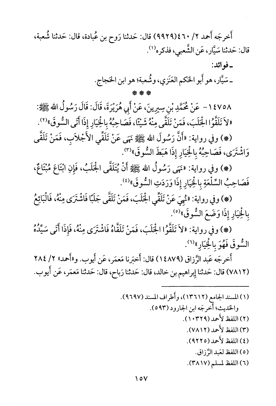 - وفي رواية: «لا تلقوا الجلب، فمن تلقاه فاشترى منه، فإذا أتى سيده السوق فهو بالخيار» (¬٥).