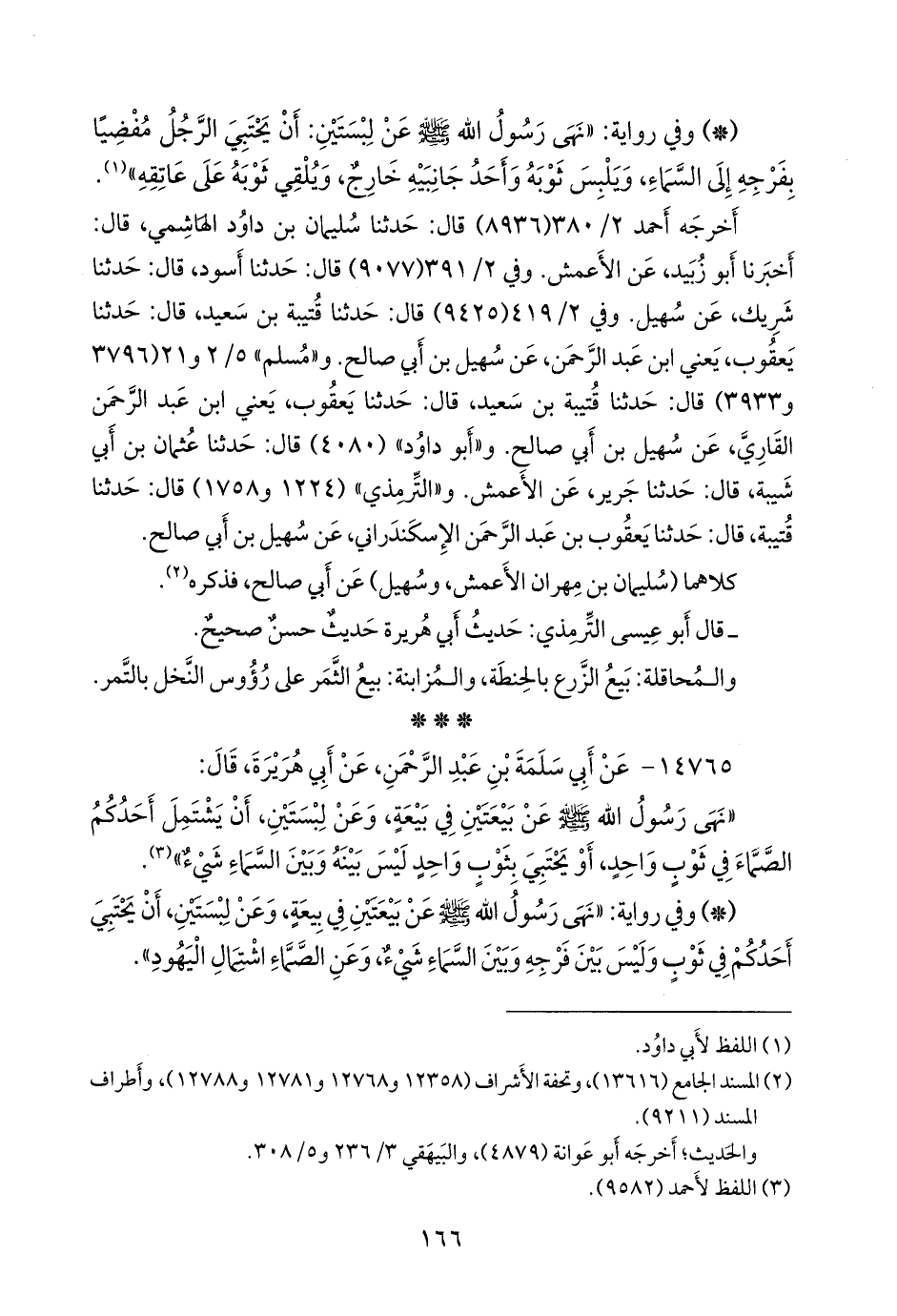 - وفي رواية: «نهى رسول الله صَلى الله عَليه وسَلم عن بيعتين في بيعة، وعن لبستين: أن يحتبي أحدكم في ثوب وليس بين فرجه وبين السماء شيء، وعن الصماء اشتمال اليهود».