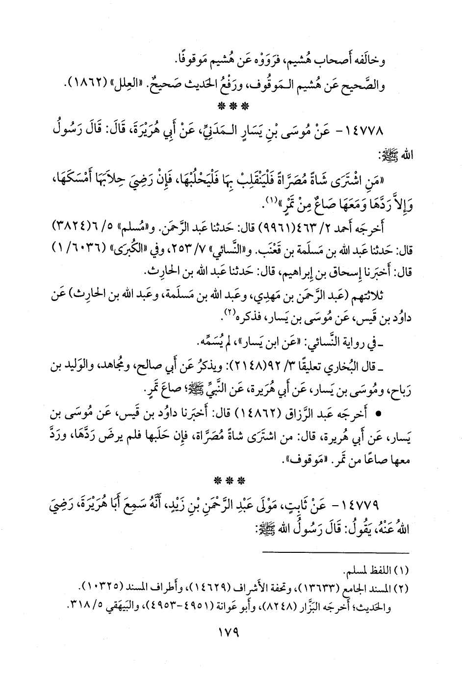 - قال البخاري تعليقا ٣/ ٩٢ (٢١٤٨): ويذكر عن أبي صالح، ومجاهد، والوليد بن رباح، وموسى بن يسار، عن أبي هريرة، عن النبي صَلى الله عَليه وسَلم؛ صاع تمر.