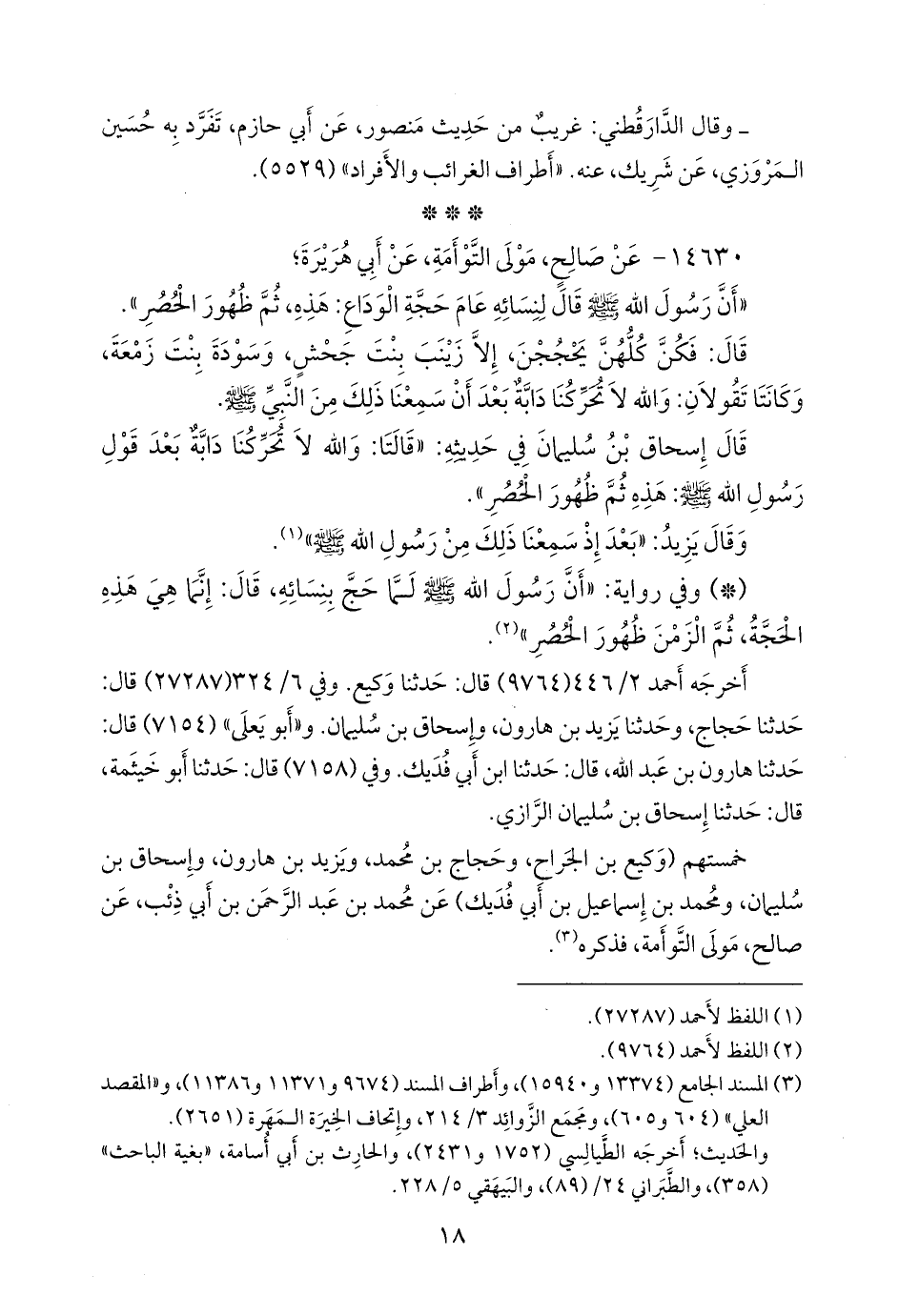 خمستهم (وكيع بن الجراح، وحجاج بن محمد، ويزيد بن هارون، وإسحاق بن سليمان، ومحمد بن إسماعيل بن أبي فُديك) عن محمد بن عبد الرَّحمَن بن أبي ذِئب، عن صالح مولى التوأمة، فذكره (¬٣).