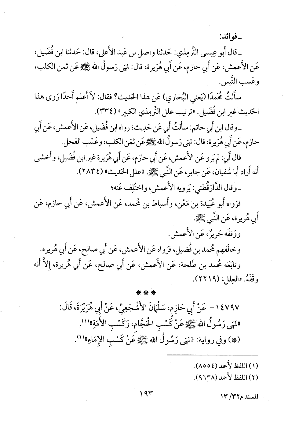 - وقال ابن أبي حاتم: سألتُ أبي عن حديثٍ؛ رواه ابن فضيل، عن الأعمش، عن أبي حازم، عن أبي هريرة، قال: نهى رسول الله صَلى الله عَليه وسَلم عن ثمن الكلب، وعسب الفحل.