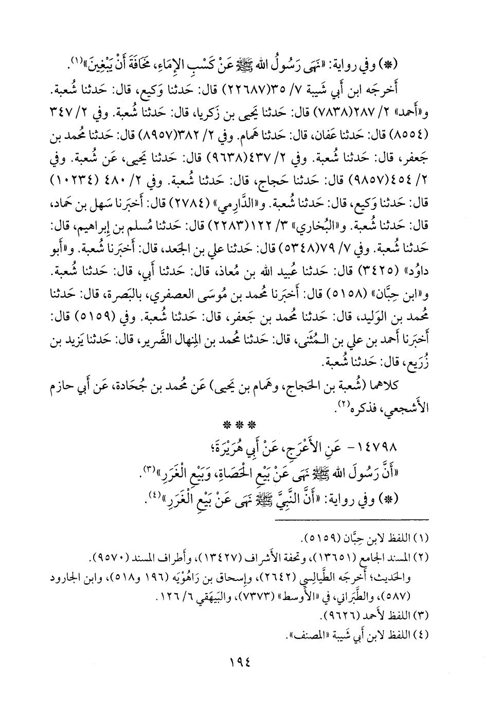 - وفي رواية: «أن النبي صَلى الله عَليه وسَلم نهى عن بيع الغرر» (¬٢).