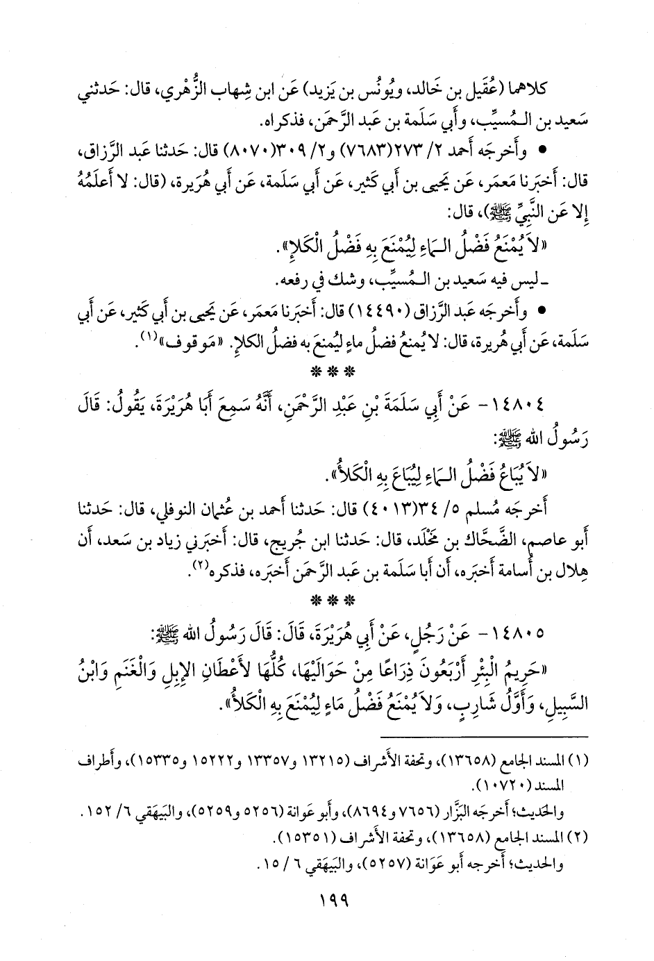 «حريم البئر أربعون ذراعا من حواليها، كلها لأعطان الإبل والغنم وابن السبيل، وأول شارب، ولا يمنع فضل ماء ليمنع به الكلأ».