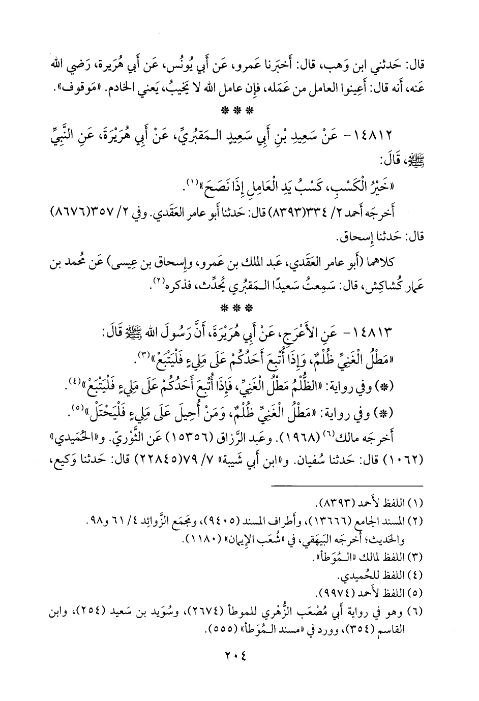 قال: حدثنا سفيان. و «أحمد» ٢/ ٢٤٥ (٧٣٣٢) قال: حدثنا سفيان. وفي ٢/ ٢٥٤ (٧٤٤٦) قال: حدثنا رِبعي بن إبراهيم، قال: حدثنا عبد الرَّحمَن. وفي ٢/ ٣٧٦ (٨٨٨٣) قال: حدثنا عبد الرزاق، قال: أخبرنا سفيان. وفي ٢/ ٣٨٠ (٨٩٢٥) قال: حدثنا محمد بن إدريس، قال: أخبرنا مالك. وفي ٢/ ٤٦٣ (٩٩٧٤) قال: حدثنا وكيع، قال: حدثنا سفيان. وفي ٢/ ٤٦٤ (٩٩٧٩) قال: حدثنا عبد الرَّحمَن، عن سفيان. وفي ٢/ ٤٦٥ (١٠٠٠٣) قال: حدثنا إسحاق، قال: أخبرني مالك. و «الدَّارِمي» (٢٧٤٩) قال: أخبرنا خالد بن مخلد، قال: حدثنا مالك.
