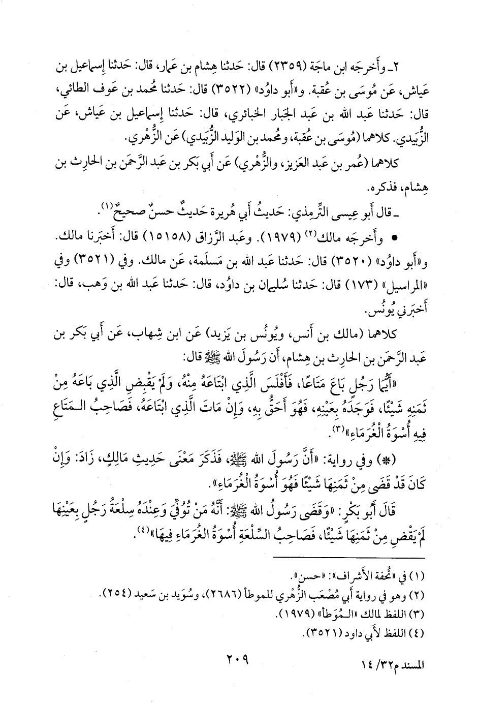 (¬٢) يعني نحو حديث عبد الله بن مَسلمة، عن مالك، والآتي في التخريج التالي، عند أَبي داود (٣٥٢٠).