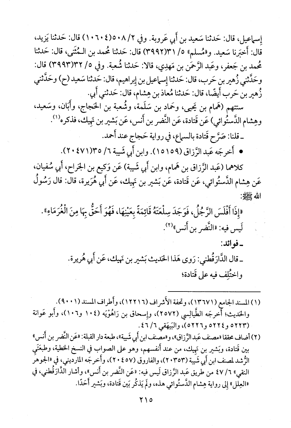 ستتهم (همام بن يحيى، وحماد بن سلمة، وشعبة بن الحجاج، وأبان، وسعيد، وهشام الدَّستوائي) عن قتادة، عن النضر بن أنس، عن بشير بن نَهِيك، فذكره (¬١).
