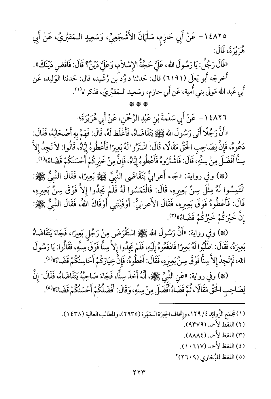 - وفي رواية: «أن رسول الله صَلى الله عَليه وسَلم استقرض من رجل بعيرا، فجاء يتقاضاه بعيره، فقال: اطلبوا له بعيرا فادفعوه إليه، فلم يجدوا إلا سنا فوق سنه، فقالوا: يا رسول الله، لم نجد إلا سنا فوق سن بعيره، فقال: أعطوه، فإن خياركم أحاسنكم قضاء» (¬٣).