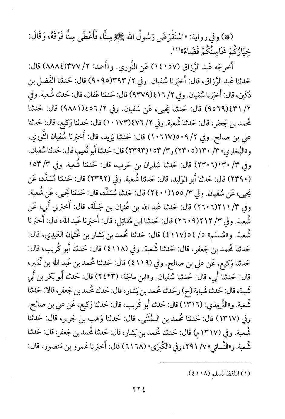 وفي ٢/ ٥٠٩ (١٠٦١٧) قال: حدثنا يزيد، قال: أخبرنا سفيان الثوري. و «البخاري» ٣/ ١٣٠ (٢٣٠٥) و ٣/ ١٥٣ (٢٣٩٣) قال: حدثنا أَبو نُعيم، قال: حدثنا سفيان. وفي ٣/ ١٣٠ (٢٣٠٦) قال: حدثنا سليمان بن حرب، قال: حدثنا شعبة. وفي ٣/ ١٥٣ (٢٣٩٠) قال: حدثنا أَبو الوليد، قال: حدثنا شعبة. وفي (٢٣٩٢) قال: حدثنا مُسدد، عن يحيى، عن سفيان. وفي ٣/ ١٥٥ (٢٤٠١) قال: حدثنا مُسدد، قال: حدثنا يحيى، عن شعبة. وفي ٣/ ٢١١ (٢٦٠٦) قال: حدثنا عبد الله بن عثمان بن جبلة، قال: أخبرني أبي، عن شعبة. وفي ٣/ ٢١٢ (٢٦٠٩) قال: حدثنا ابن مقاتل، قال: أخبرنا عبد الله، قال: أخبرنا شعبة. و «مسلم» ٥/ ٥٤ (٤١١٧) قال: حدثنا محمد بن بشار بن عثمان العبدي، قال: حدثنا محمد بن جعفر، قال: حدثنا شعبة. وفي (٤١١٨) قال: حدثنا أَبو كُريب، قال: حدثنا وكيع، عن علي بن صالح. وفي (٤١١٩) قال: حدثنا محمد بن عبد الله بن نُمير، قال: حدثنا أبي، قال: حدثنا سفيان. و «ابن ماجة» (٢٤٢٣) قال: حدثنا أَبو بكر بن أبي شيبة، قال: حدثنا شبابة (ح) وحدثنا محمد بن بشار، قال: حدثنا محمد بن جعفر، قالا: حدثنا شعبة. و «التِّرمِذي» (١٣١٦) قال: حدثنا أَبو كُريب، قال: حدثنا وكيع، عن علي بن صالح. وفي (١٣١٧) قال: حدثنا محمد بن المثنى، قال: حدثنا وهب بن جرير، قال: حدثنا شعبة. وفي (١٣١٧ م) قال: حدثنا محمد بن بشار، قال: حدثنا محمد بن جعفر، قال: حدثنا شعبة. و «النَّسَائي» ٧/ ٢٩١، وفي «الكبرى» (٦١٦٨) قال: أخبرنا عَمرو بن منصور، قال: