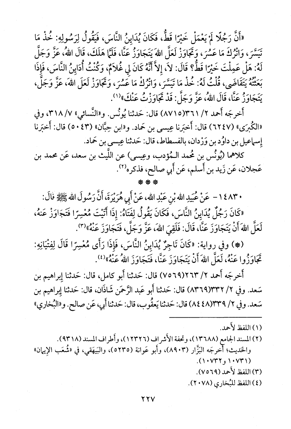 - وفي رواية: «كان تاجر يداين الناس، فإذا رأى معسرا قال لفتيانه: تجاوزوا عنه، لعل الله أن يتجاوز عنا، فتجاوز الله عنه» (¬٢).