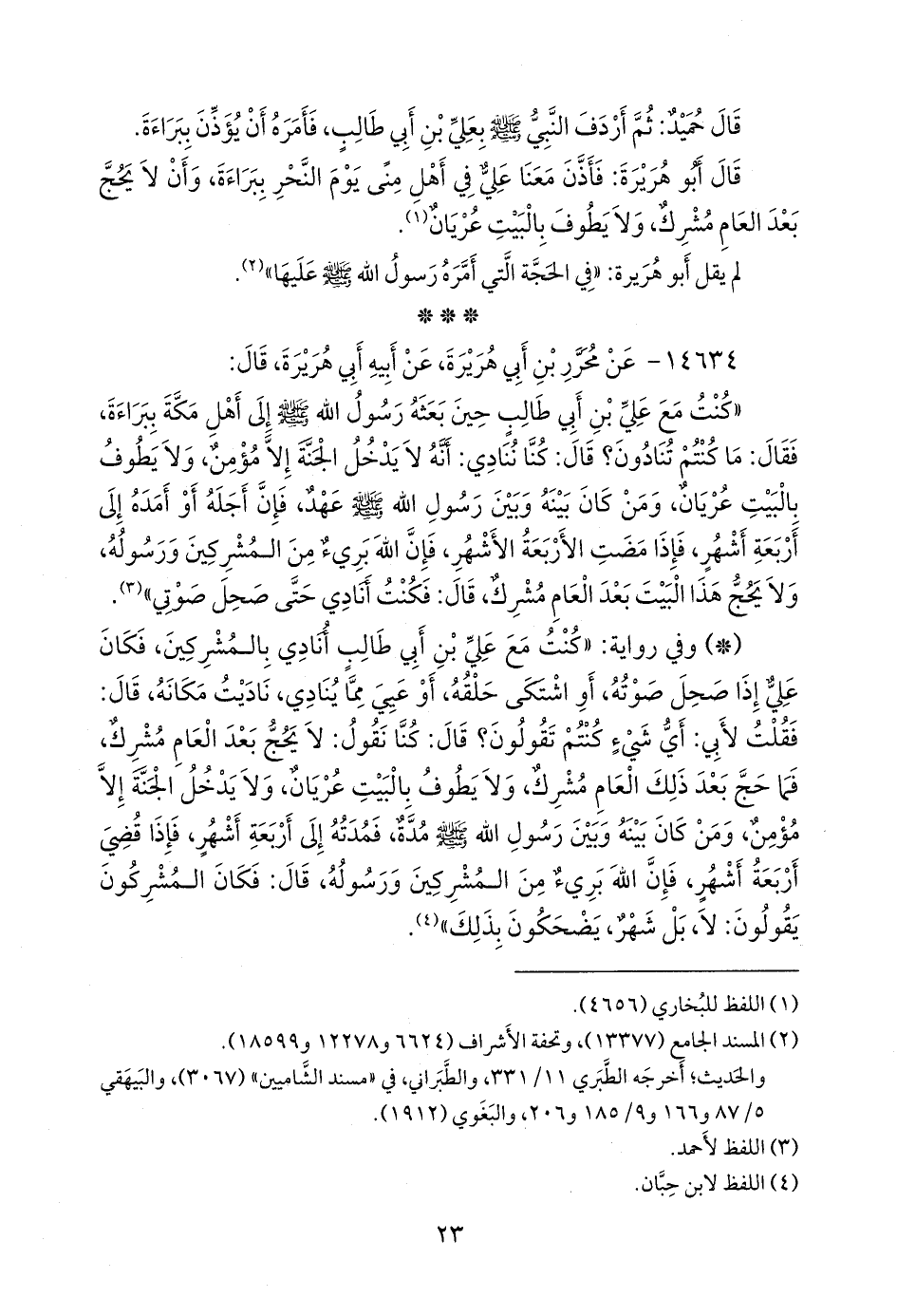 - وفي رواية: «كنت مع علي بن أبي طالب أنادي بالمشركين، فكان علي إذا صحل صوته، أو اشتكى حلقه، أو عيي مما ينادي، ناديت مكانه، قال: فقلت لأبي: أي شيء كنتم تقولون؟ قال: كنا نقول: لا يحج بعد العام مشرك، فما حج بعد ذلك العام مشرك، ولا يطوف بالبيت عريان، ولا يدخل الجنة إلا مؤمن، ومن كان بينه وبين رسول الله صَلى الله عَليه وسَلم مدة، فمدته إلى أربعة أشهر، فإذا قضي أربعة أشهر، فإن الله بريء من المشركين ورسوله، قال: فكان المشركون يقولون: لا، بل شهر، يضحكون بذلك» (¬٢).