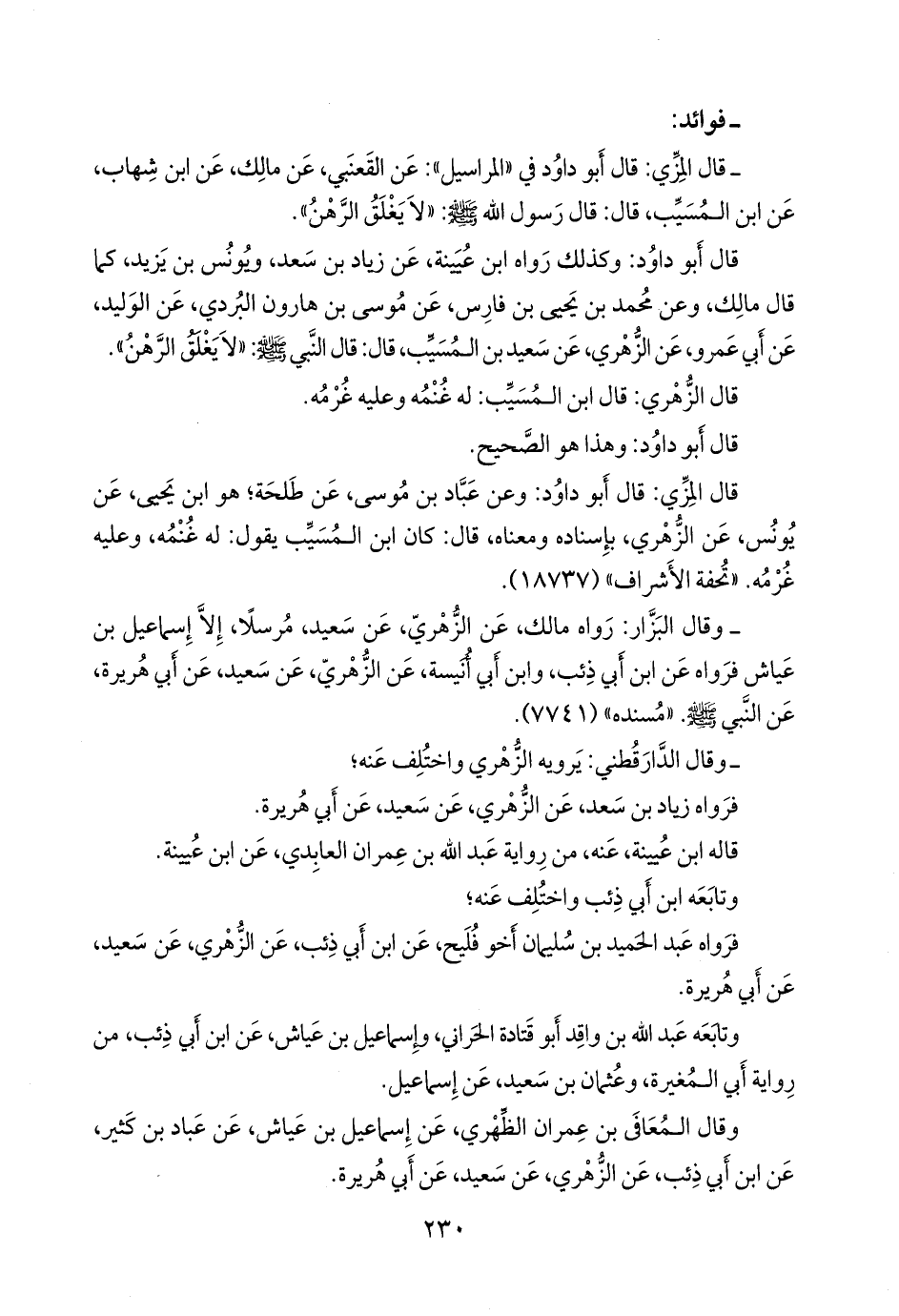 - قال المِزِّي: قال أَبو داود في «المراسيل»: عن القَعنَبي، عن مالك، عن ابن شهاب، عن ابن المُسَيب، قال: قال رسول الله صَلى الله عَليه وسَلم: «لا يغلق الرهن».