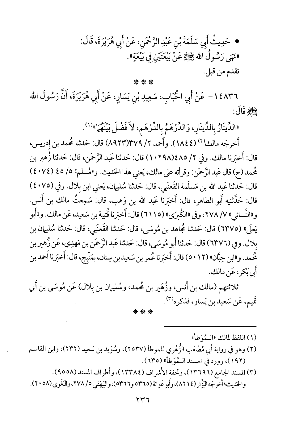أخرجه مالك (¬٢) (١٨٤٤). وأحمد (٨٩٢٣) قال: حدثنا محمد بن إدريس، قال: أخبرنا مالك. وفي ٢/ ٤٨٥ (١٠٢٩٨) قال: حدثنا عبد الرَّحمَن، قال: حدثنا زهير بن محمد (ح) قال عبد الرَّحمَن: وقرأته على مالك، يعني هذا الحديث. و «مسلم» ٥/ ٤٥ (٤٠٧٤) قال: حدثنا عبد الله بن مَسلَمة القَعنَبي، قال: حدثنا سليمان، يعني ابن بلال. وفي (٤٠٧٥) قال: حدثنيه أَبو الطاهر، قال: أخبرنا عبد الله بن وهب، قال: سمعت مالك بن أنس. و «النَّسَائي» ٧/ ٢٧٨، وفي «الكبرى» (٦١١٥) قال: أخبرنا قتيبة بن سعيد، عن مالك. و «أَبو يَعلى» (٦٣٧٥) قال: حدثنا مجاهد بن موسى، قال: حدثنا القَعنَبي، قال: حدثنا سليمان بن بلال. وفي (٦٣٧٦) قال: حدثنا أَبو موسى، قال: حدثنا عبد الرَّحمَن بن مهدي، عن زهير بن محمد. و «ابن حِبَّان» (٥٠١٢) قال: أخبرنا عمر بن سعيد بن سنان، بِمَنْبِج، قال: أخبرنا أحمد بن أَبي بكر، عن مالك.