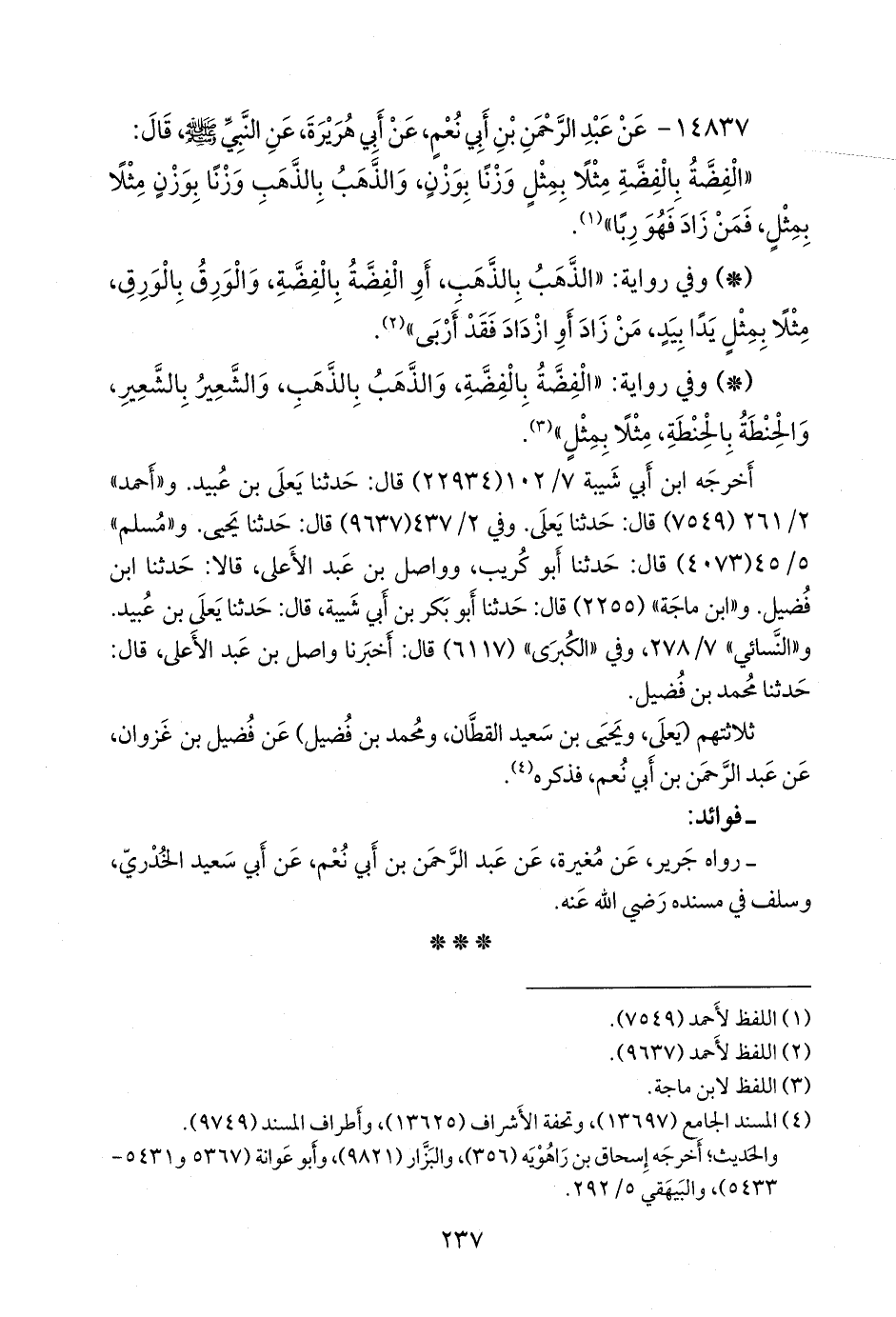 - وفي رواية: «الفضة بالفضة، والذهب بالذهب، والشعير بالشعير، والحنطة بالحنطة، مثلا بمثل» (¬٣).