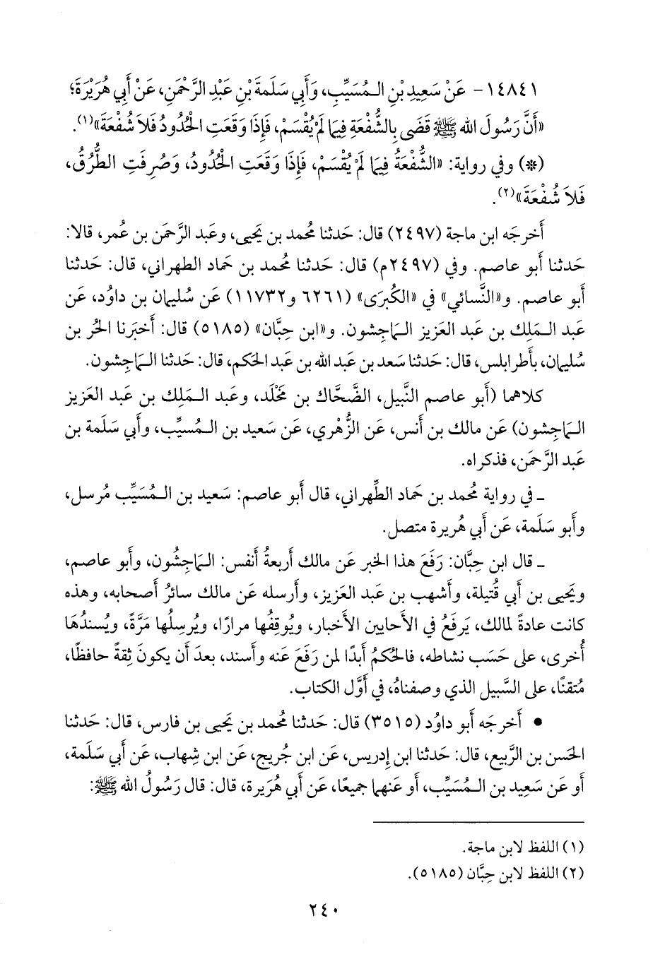 - في رواية محمد بن حماد الطِّهْراني، قال أَبو عاصم: سعيد بن المُسَيب مرسل، وأَبو سلمة، عن أبي هريرة متصل.