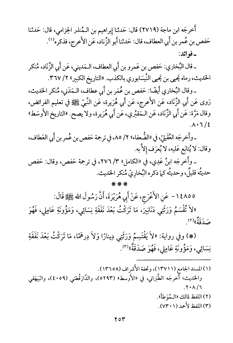 - وقال البخاري أيضا: حفص بن عمر بن أبي عطاف، المدني، منكر الحديث، روى عن أبي الزناد، عن الأعرج، عن أبي هريرة، عن النبي صَلى الله عَليه وسَلم في تعليم الفرائض، وقال مرة: عن أبي الزناد، عن المَقبُري، عن أبي هريرة، ولا يصح. «التاريخ الأوسط» ٤/ ٨٠٦.