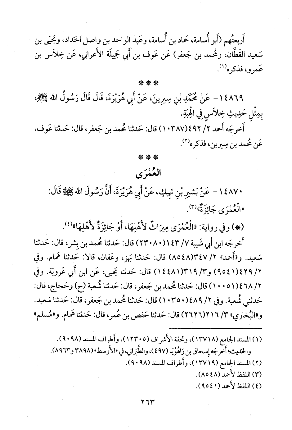 ١٤٨٦٩ - عن محمد بن سِيرين، عن أبي هريرة، قال قال رسول الله صَلى الله عَليه وسَلم بمثل حديث خلاس في الهبة.