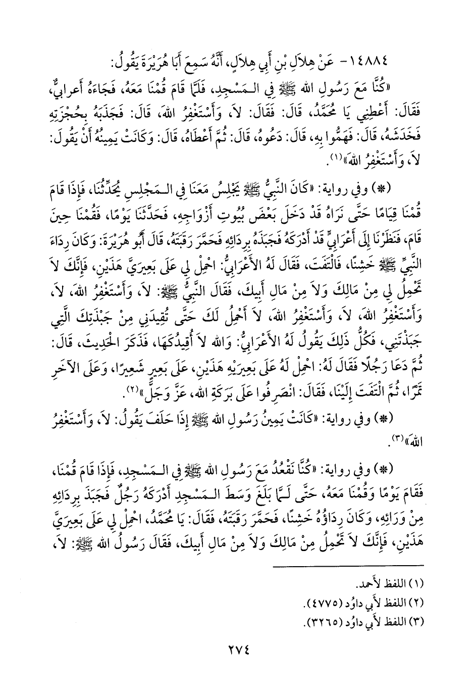 «كنا مع رسول الله صَلى الله عَليه وسَلم في المسجد، فلما قام قمنا معه، فجاءه أعرابي، فقال: أعطني يا محمد، قال: فقال: لا، وأستغفر الله، قال: فجذبه بحجزته فخدشه، قال: فهموا به، قال: دعوه، قال: ثم أعطاه، قال: وكانت يمينه أن يقول: لا، وأستغفر الله» (¬١).