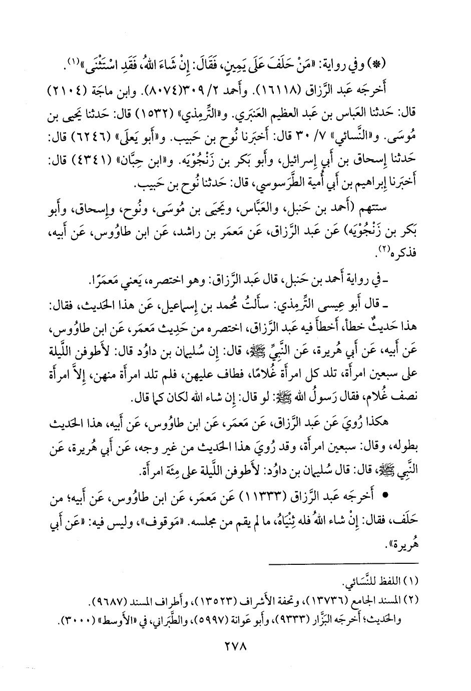 - قال التِّرمِذي: سألت محمد بن إسماعيل، عن هذا الحديث، فقال: هذا حديثٌ خطأ أخطأ فيه عبد الرزاق، اختصره من حديث معمر، عن ابن طاووس، عن أبيه، عن أبي هريرة، عن النبي صَلى الله عَليه وسَلم قال: إن سليمان بن داود قال: لأطوفن الليلة على سبعين امرأة، تلد كل امرأة غلاما، فطاف عليهن، فلم تلد امرأة منهن، إلا امرأة نصف غلام، فقال رسول الله صَلى الله عَليه وسَلم: لو قال: إن شاء الله لكان كما قال.