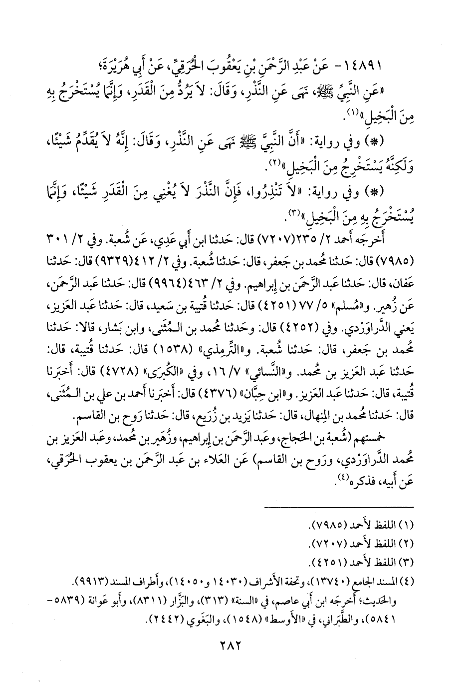 خمستهم (شعبة بن الحجاج، وعبد الرَّحمَن بن إبراهيم، وزهير بن محمد، وعبد العزيز بن محمد الدراوَرْدي، وروح بن القاسم) عن العلاء بن عبد الرَّحمَن بن يعقوب الحُرَقِي، عن أبيه، فذكره (¬٤).